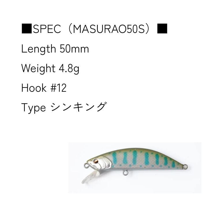 トラウトルアーフィッシングでの様々なシチュエーションにおいてアングラーがルアーに求める性能を高次元で実現したミノー『MASURAO50s』。アップストリームでは、ロッドアクションによるレスポンスの良さを極限まで追及しアングラーの意のままにルアーを操りキレのある平打ちでトラウトを魅了する。クロスからダウンストリームにおいては、水押しが強く複雑な流れの中でもバランスを崩さずに魚にルアーを見せて誘う事が可能です。 『MASURAO50s』の圧倒的実力と使用感、是非お試しください